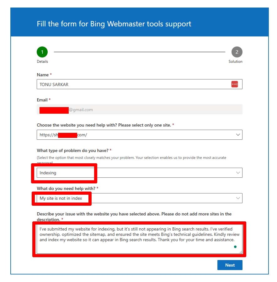 Step-3: Now, a message box will appear. Here, you’ll need to select your website, the type of problem you’re facing, and the kind of assistance you’re looking for. Finally, you’ll see another text box where you can briefly explain your issue. Once done, click Next to continue.