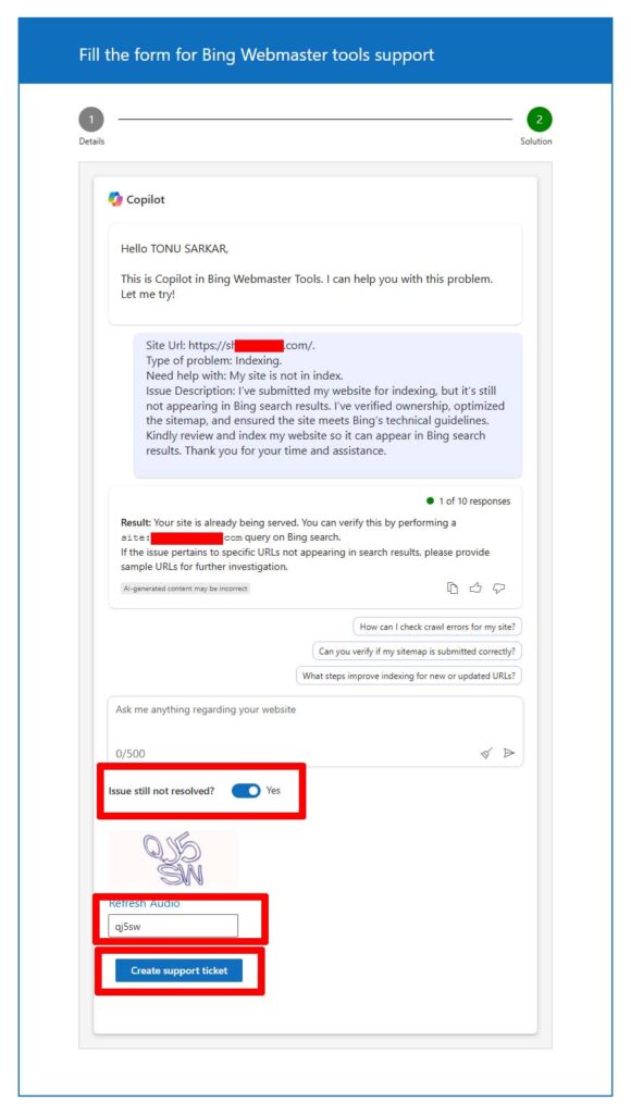 If it works, great! But if your issue remains unresolved, turn on the “Issue still not resolved” option. Then complete the CAPTCHA verification and click “Create Support Ticket.”