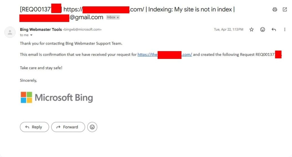 Step-5: In this final step, you’ll receive a confirmation or thank-you email at the address linked to your Bing Webmaster account. This means your request has been successfully submitted to Bing Webmaster Support.